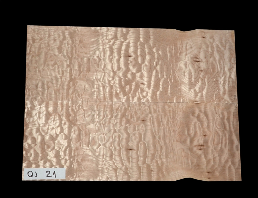 Quilt javor (quilted maple) patrí medzi najatraktívnejšie dreviny pre vrchné dosky gitár vďaka svojej „vlnovej“ 3D kresbe, ktorá vytvára luxusný a pútavý vzhľad najmä pod priehľadným alebo polopriehľadným lakom. Tento konkrétny pár QJ-21 predstavuje výberový, nelepený masív profesionálne vysušený a presne opracovaný na hrúbku cca 5 mm – pripravený priamo do výroby.