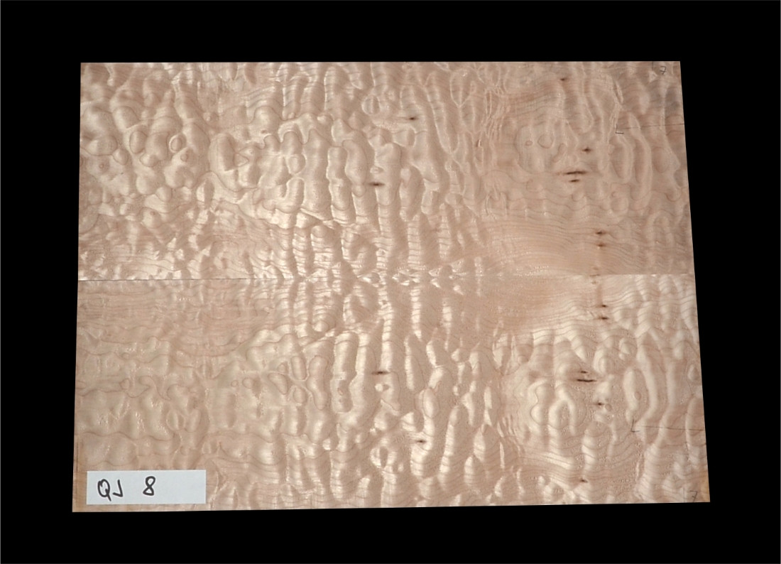 Quilt javor (quilted maple) patrí medzi najatraktívnejšie dreviny pre vrchné dosky gitár vďaka svojej „vlnovej“ 3D kresbe, ktorá vytvára luxusný a pútavý vzhľad najmä pod priehľadným alebo polopriehľadným lakom. Tento konkrétny pár QJ-8 predstavuje výberový, nelepený masív profesionálne vysušený a presne opracovaný na hrúbku cca 5 mm – pripravený priamo do výroby.